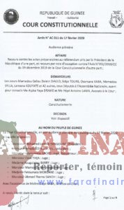 La Cour Constitutionnelle de Guinée a rendu en date du 17 février 2020 un arrêt et s’est déclarée «incompétente» pour connaître les deux requêtes des opposants du Pr Alpha Condé, président de la République de Guinée.