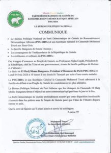 Le PDG-RDA et son Secrétaire Général le Camarade Mohamed Touré adressent à la famille du défunt et au Peuple de Guinée les condoléances les plus attristées.