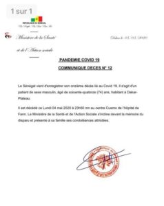 La République du Sénégal vient juste d’enregistrer son 11ème décès lié au Coronavirus aux environs de minuit, selon le communiqué du Ministère sénégalais de la Santé