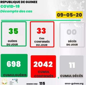 Ce qui fait au total 2042 cas confirmés positifs depuis le 12 mars 2020, la date de l’apparition de la maladie en République de Guinée: 698 personnes guéries et 11 décès