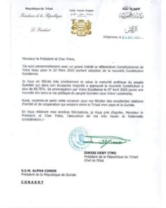 Adoption nouvelle Constitution Guinéenne: Le Président Déby félicite Alpha Condé et salue la maturité politique du peuple Guinéen