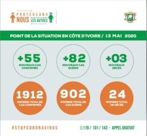 Quant à la Côte d’ivoire, elle a enregistré 1912 Cas confirmés de Coronavirus dont 902 guéris depuis la date de l’apparition du virus en terre ivoirienne