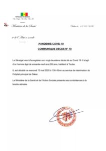 A rappeler que 2105 Cas ont été déclarés positifs au Sénégal, dont 782 guéris, 22 décédés et 1 301 sous traitement, selon les services du Ministère Sénégalais de la Santé qui rassurent sur la stabilité de l’Etat de santé des autres patients.