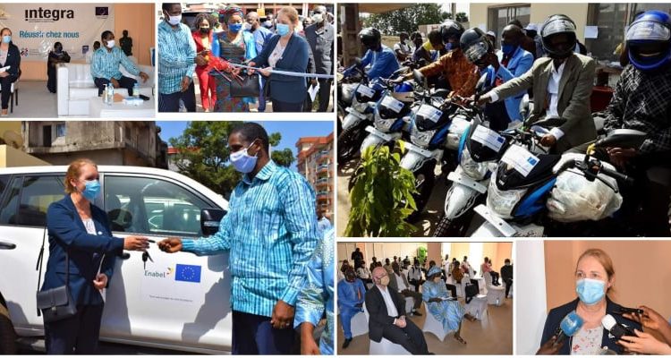 Cérémonie de remise officielle de la maison des jeunes de Matam, rénovée et équipée par Enabel, dans le cadre du Programme INTEGRA, financé par l’UE. Véhicule 4×4, motos et équipements informatiques, ont également été remis au Ministère de la jeunesse, en appui à ses structures, dans les communes de Conakry et de Coyah.