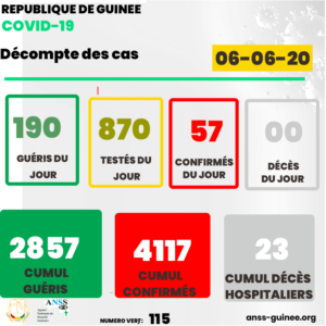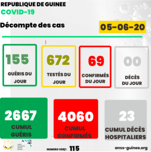 Les médecins de l’ANSS (Agence Nationale pour la Sécurité Sanitaire) donnent entière satisfaction de jour en jour. La preuve en chiffres de personnes guéries : 155 ce vendredi 05 juin et 190 ce samedi 06 juin 2020 donc 345 en 48 heures