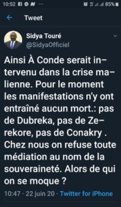 Décidément, les opposants du Pr. Alpha Condé, Président de la République de Guinée, ne ratent aucune occasion pour tirer à boulets rouges sur lui. En témoigne ce tweet de Sidya Touré, président de l’UFR (Union des Forces Républicaines) après avoir appris par voie de presse que le Président Guinéen s’est personnellement impliqué dans la résolution de la crise malienne. «Ainsi A. Condé serait intervenu dans la crise. Pour le moment les manifestations n’y ont entraîné aucun mort : pas de Dubréka, pas de N’Zérékoré, pas de Conakry. Chez nous on refuse toute médiation au nom de la souveraineté». Et l’ancien Haut Représentant du Chef de l’Etat de s’interroger : «Alors de qui se moque ? »