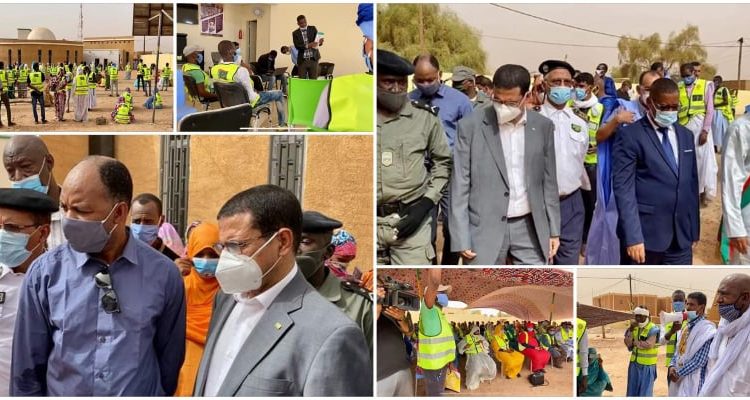 Le Ministre de l’Emploi, de la Jeunesse et des Sports, Monsieur Taleb Ould Sid’Ahmed en compagnie de son homologue de la Santé, Dr Nedhirou Ould Hamed, a donné ce matin à Kiffa le coup du programme Watanouna des volontaires pour la veille communautaire.