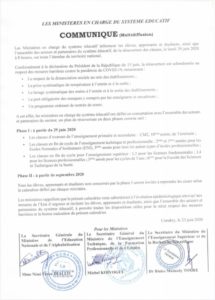 « Les Ministères en Charge du système éducatif informent les élèves, apprenants et étudiants ainsi que l’ensemble des acteurs et partenaires du système éducatif de la réouverture des classes, le lundi 29 juin 2020 à 8 heures sur l’étendue du territoire national » C’est ainsi commence le communiqué des Ministères en Charge du système éducatif relatif à la réouverture des classes.