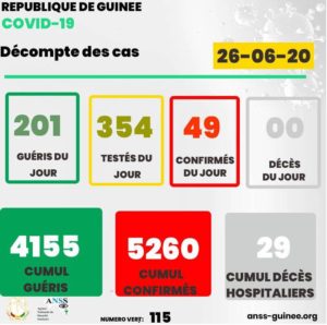 Les médecins de l’Agence Nationale de la Sécurité Sanitaire (ANSS) sont en train de faire du bon travail pour sauver de très nombreuses vies humaines. Ce travail mérite d’être vu, connu et reconnu par tous. La preuve par les chiffres du décompte des cas du jour de l’ANSS en ces termes « Trouvez en infographie les données du 25 juin et la mise à jour des cumuls(guéris, confirmés et décès) du COVID-19 en Guinée à la date du 26-06-2020. Tous engagés pour la stratégie#StopCovid19en60jours
