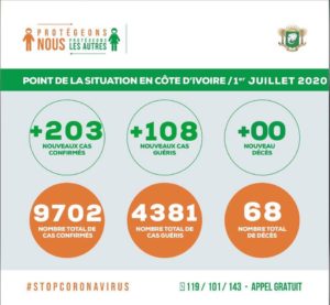 Point de la situation du mercredi 1er juillet 2020 : Protégeons-nous et protégeons les autres, adoptons les bonnes pratiques et mettons en application les mesures de prévention. #Stopcoronavirus#COVID19CI