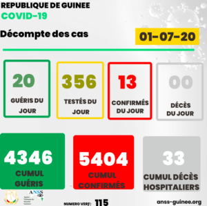 Trouvez en infographie les données du 30 juin et la mise à jour des cumuls(guéris, confirmés et décès) du COVID-19 en Guinée à la date du 01-07-2020. Tous engagés pour la stratégie #StopCovid19en60jours