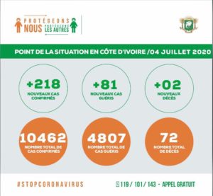 Point de la situation du samedi 4 juillet 2020: Afin de freiner la propagation de la COVID-19 dans notre pays, chacun de nous doit se protéger et protéger les autres en continuant d’appliquer scrupuleusement les gestes barrières.