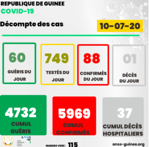 Trouvez en infographie les données du 09 juillet et la mise à jour des cumuls(guéris, confirmés et décès) du COVID-19 en Guinée à la date du 10-07-2020. Tous engagés pour la stratégie #StopCovid19en60jours