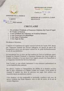 Me Mory Doumbouya, le désormais Ministre Guinéen de la Justice, Garde des sceaux, n’est pas du tout content. Et il l’a fait savoir à travers une circulaire adressée aux Premiers Présidents et Procureurs Généraux des Cours d’Appel de Conakry et Kankan, à tous les Présidents des Tribunaux de Premières Instances, à tous les Procureurs de la République, à tous les Juges d’instructions et à tous les Juges de Paix en ces termes