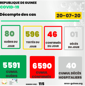 Trouvez en infographie les données du 19 juillet et la mise à jour des cumuls(guéris, confirmés et décès) du COVID-19 en Guinée à la date du 20-07-2020. Tous engagés pour la stratégie#StopCovid19en60jours