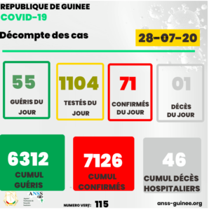 Covid-19 en Guinée: 1 nouveau décès, 55 guéris, 71 nouveaux cas Publié par farafinainfo.com Le 28 Juil, 2020 Partager FacebookTwitterGoogle+ReddItWhatsAppPinterestEmailFacebook MessengerLinkedinLINEViberPrint Trouvez en infographie les données du 27 juillet et la mise à jour des cumuls(guéris, confirmés et décès) du COVID-19 en Guinée à la date du 28-07-2020 Autres articles Fellah Kaké : « C’est pourquoi Patrice Talon et la… 16 Déc, 2025 COOPÉRATION GUINÉE-MALI – Bah Oury : « « Tout ce… 10 Déc, 2025 Et si obtenir un document en Afrique devenait… 9 Déc, 2025 . Partager FacebookTwitterGoogle+ReddItWhatsAppPinterestEmailFacebook MessengerLinkedinLINEViberPrint