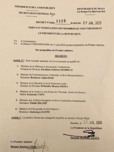 Ibrahim Boubacar Keita, Président de la République du Mali, a formé, lundi 27 juillet 2020, un Gouvernement très restreint pour ainsi dire de six (6) membres.