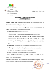 A ce jour 11380 cas ont été déclarés positifs dont 7449 guéris,238 décédés,3692 sous traitement #cov19sn