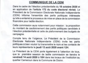 «Dans le cadre de l’élection présidentielle du 18 octobre 2020 et application de l’article 172 du code électoral révisé, Le Président de la Commission Électorale Nationale Indépendante (CENI) informe l’ensemble des partis politiques intéressés qu’elle a entamé le processus de mise en place de la commission financière de ladite élection», c’est ainsi que commence le communiqué de la CENI formant les partis politiques qui prennent part au processus électoral en République de Guinée. Et d’évoquer de la mission de ladite Commission en ces termes : «Cette commission aura notamment pour mission : la proposition du montant de cautionnement des partis politiques candidats à l’élection présidentielles et celle de plafonnement des budgets de campagne »