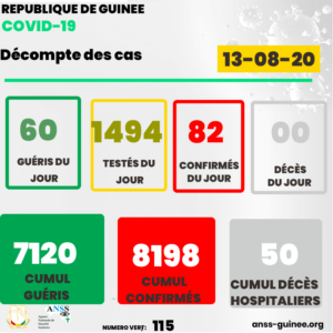 Covid-19 en Guinée: 60 guéris, 82 nouveaux cas Publié par farafinainfo.com Le 13 Août, 2020 Partager FacebookTwitterGoogle+ReddItWhatsAppPinterestEmailFacebook MessengerLinkedinLINEViberPrint Trouvez ci-bas les données du 12 août et la mise à jour globale à la date du 13-08-20 Autres articles COOPÉRATION GUINÉE-MALI – Bah Oury : « « Tout ce… 10 Déc, 2025 Et si obtenir un document en Afrique devenait… 9 Déc, 2025 Ousmane Sonko ou la personnification de la… 9 Déc, 2025 Partager FacebookTwitterGoogle+ReddItWhatsAppPinterestEmailFacebook MessengerLinkedinLINEViberPrint