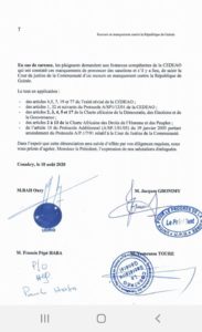 Objet : Dénonciation et Plainte devant les Instances compétentes de la CEDEAO contre la République de Guinée pour manquement à ses obligations communautaires : violation grave des droits humains, changement anticonstitutionnel pour se maintenir au pouvoir et falsification de la Constitution adoptée par référendum le 22 mars 2020.