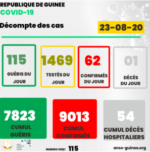 Covid-19 en Guinée: 1 nouveau décès, 115 guéris, 62 nouveaux cas Publié par farafinainfo.com Le 24 Août, 2020 Partager FacebookTwitterGoogle+ReddItWhatsAppPinterestEmailFacebook MessengerLinkedinLINEViberPrint Trouvez ci-bas les données du 22 août et la mise à jour globale à la date du 23-08-20 Autres articles GMD face aux réalités du pouvoir post transition… 13 Jan, 2026 Cellou Dalein Diallo, leader politique ou chef de… 12 Jan, 2026 M. Touré : « si Monsieur Cellou et Monsieur Alpha… 12 Jan, 2026 Partager FacebookTwitterGoogle+ReddItWhatsAppPinterestEmailFacebook MessengerLinkedinLINEViberPrint