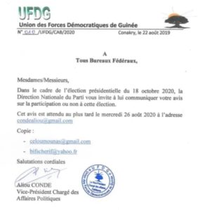Pour sa participation ou non à l’élection présidentielle guinéenne du 18 octobre 2020, les leaders de l’UFDG (Union des Forces Démocratiques de Guinée), qui se disent démocrates veulent consulter leur base avant d’aller à cette présidentielle, ont fait cette annonce « Dans le cadre de l’élection présidentielle du 18 octobre 2020, la Direction Nationale du Parti vous invite à lui communiquer votre avis sur la participation ou non à cette élection.