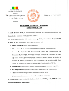 A ce jour 13294 cas ont été déclarés positifs dont 8974 guéris,277 décédés,4042 sous traitement #cov19sn