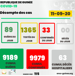 Covid-19 en Guinée: 89 guéris, 33 nouveaux cas Publié par farafinainfo.com Le 12 Sep, 2020 Partager FacebookTwitterGoogle+ReddItWhatsAppPinterestEmailFacebook MessengerLinkedinLINEViberPrint Trouvez ci-bas les données du 10 septembre et la mise à jour globale à la date du 11-09-20 Autres articles GMD face aux réalités du pouvoir post transition… 13 Jan, 2026 Cellou Dalein Diallo, leader politique ou chef de… 12 Jan, 2026 M. Touré : « si Monsieur Cellou et Monsieur Alpha… 12 Jan, 2026 Partager FacebookTwitterGoogle+ReddItWhatsAppPinterestEmailFacebook MessengerLinkedinLINEViberPrint