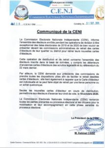 «La Commission Électorale Nationale Indépendante (CENI) informe l’ensemble des électeurs enrôlés pendant les opérations de révision à titre exceptionnel des listes électorales de 2019 et 2020 de bien vouloir se présenter devant les commissions administratives de retrait des cartes d’électeurs de leur quartier ou district pour retirer leurs nouvelles cartes d’électeurs», a informé la CENI.