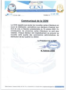 Kabinet Cissé, Président de la Commission Électorale Nationale Indépendante (CENI) vient de publier un important communiqué en ces termes : «La CENI rappelle que seules les nouvelles cartes d’électeurs en cours de distribution, permettront aux électeurs d’exercer leur droit de vote, à l’élection présidentielle du 18 octobre 2020… »