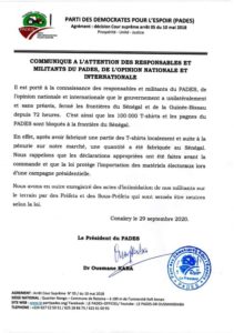 «Il est porté à la connaissance des responsables et militants du PADES, de l’opinion nationale et internationale que le gouvernement a unilatéralement et sans préavis, fermé les frontières du Sénégal et de la Guinée-Bissau depuis 72 heures. C’est ainsi que les 100.000 T-shirts et pagnes du PADES sont bloqués à la frontière du Sénégal »
