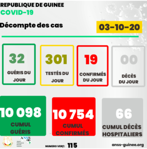 Covid-19 en Guinée: 32 guéris, 19 nouveaux cas Publié par farafinainfo.com Le 5 Oct, 2020 Partager FacebookTwitterGoogle+ReddItWhatsAppPinterestEmailFacebook MessengerLinkedinLINEViberPrint Trouvez ci-bas les données du 02 octobre et la mise à jour globale à la date du O3-10-20 Autres articles Fellah Kaké : « C’est pourquoi Patrice Talon et la… 16 Déc, 2025 COOPÉRATION GUINÉE-MALI – Bah Oury : « « Tout ce… 10 Déc, 2025 Et si obtenir un document en Afrique devenait… 9 Déc, 2025 Partager FacebookTwitterGoogle+ReddItWhatsAppPinterestEmailFacebook MessengerLinkedinLINEViberPrint