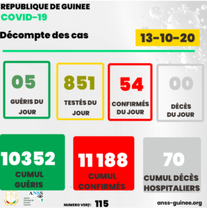 La Covid-19 est toujours en République de Guinée. Et, ce depuis le 12 mars dernier. La preuve sur le décompte des cas de l’ANSS (Agence Nationale de la Sécurité Sanitaire) de ce mardi 13 octobre 2020, qui vient d’enregistrer 54 nouveaux cas. Donc, continuons à respecter les gestes barrières comme d’habitude