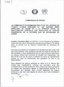 La Communauté Economique des Etats de l’Afrique de l’Ouest, l’Union Africaine et les Nations Unies appellent au calme et à la retenue avant la proclamation officielle des résultats du scrutin présidentiel du 18 octobre 2020 en République de Guinée
