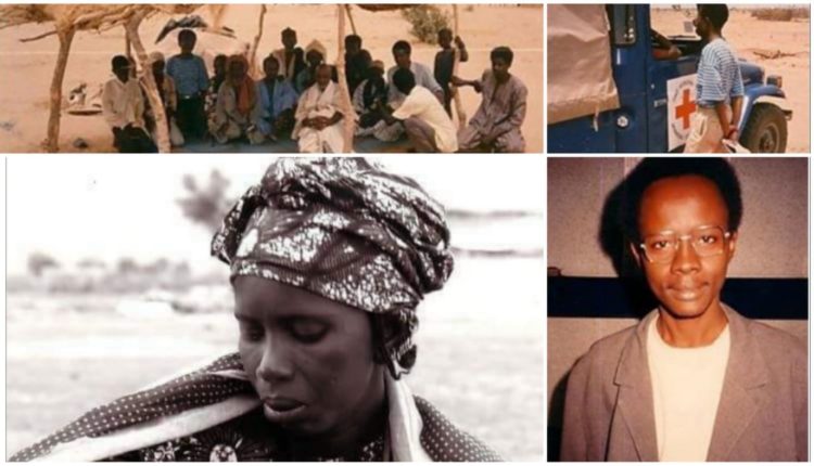 Ici au camp de Dodel au Sénégal en mai 1989 : un déporté d’un âge avancé, s’est laissé mourir le lendemain de notre visite. En terme clair, un « suicidé d’amertume et de honte ». Tous dans ce camp, ont été déportés d’Aleg et ses environs. Le dramatique événement s’est passé en ma présence (3e sur la première photo, à partir de la gauche en tee shirt à rayures horizontales bleues et blanches puis avec la Croix Rouge sur la deuxième photo et une douloureuse hospitalisation a suivi à mon retour à Dakar sur la troisième photo)