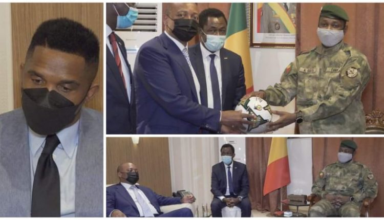 Bamako, le 21 décembre 2021, le Colonel Assimi Goïta, Président de la Transition au Mali, a reçu en audience au Palais Koulouba, Patrice Motsepe, Président de la CAF (Confédération Africaine de Football) et d’autres personnes notamment Samuel Eto’o, le tout nouveau président élu de la Fécafoot (Fédération Camerounaise de Football)