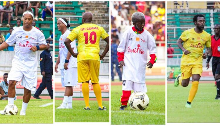 Farafinainfo.com- Actualités Sportives Guinéennes – L’ancienne star brésilienne du FC Barcelone et du Paris Saint-Germain, Ronaldinho, qui est en visite à Conakry, a pris part, ce samedi 11 mars 2023, au Stade Général Lansana Conté de Nongo, à un match de gala en compagnie des artistes musiciens et autres anciens footballeurs guinéens notamment Aboubacar Titi Camara, Pascal Feindouno …