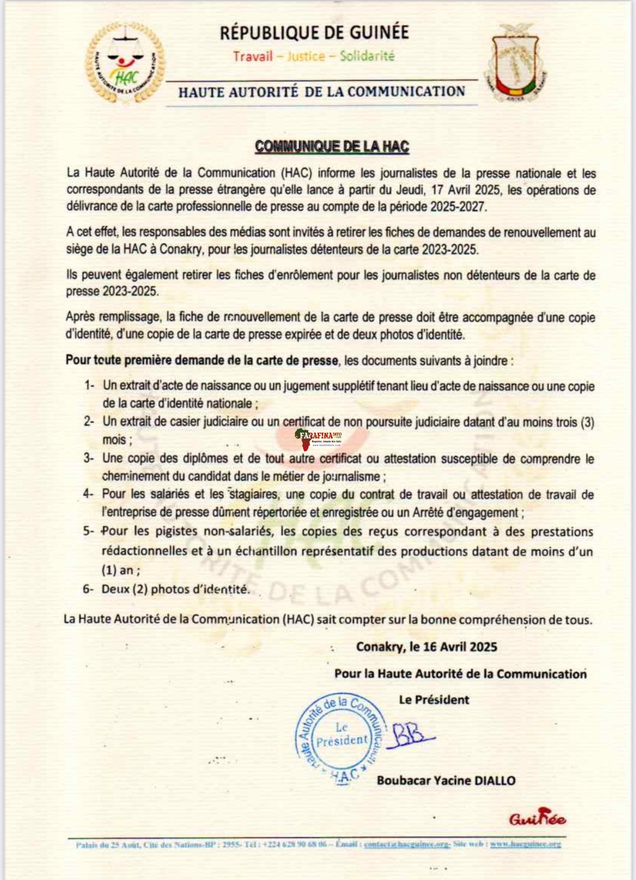 #ACTU_MÉDIAS_EN_GUINÉE. « La Haute Autorité de la Communication (HAC) informe les journalistes de la presse nationale et les correspondants de la presse étrangère qu’elle lance à partir du Jeudi, 17 avril 2025, les opérations de délivrance de la Carte Professionnelle de Presse au compte de la période 2025-2027. » C’est ainsi que l’institution régulatrice des médias en République de Guinée a entamé son communiqué informatif adressé aux professionnels de la presse nationale …