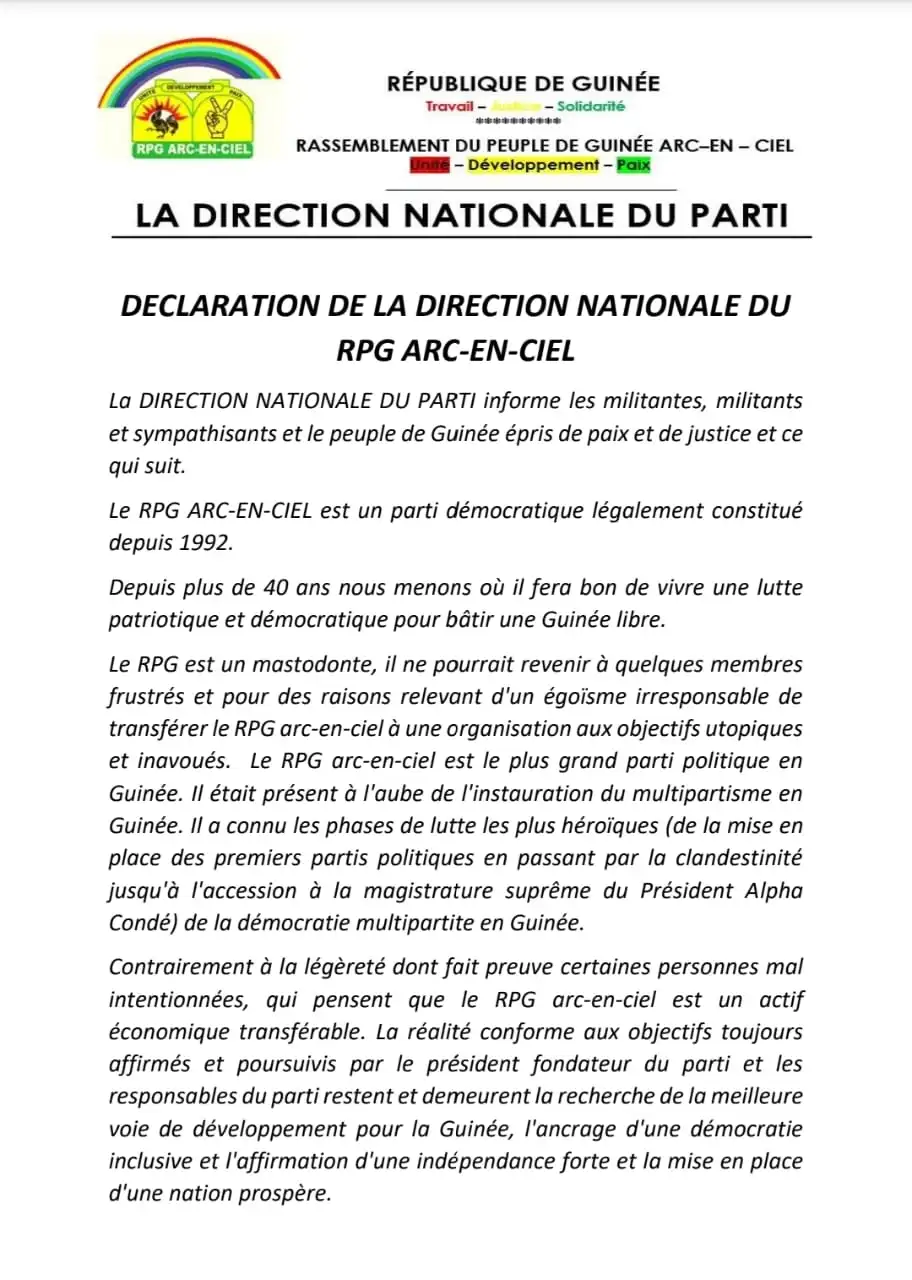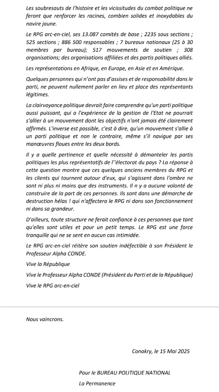 #ACTU_POLITIQUE_GUINÉENNE. Le RPG Arc-en-ciel de l’ancien Président de la République de Guinée, Pr. Alpha Condé, est décidément sous pression, mais tient visiblement bon, encore. Et a fait une déclaration solennelle, ce jeudi 15 mai 2025, à son siège national…