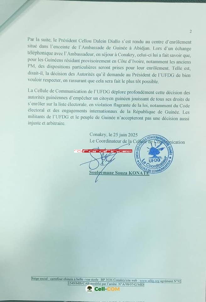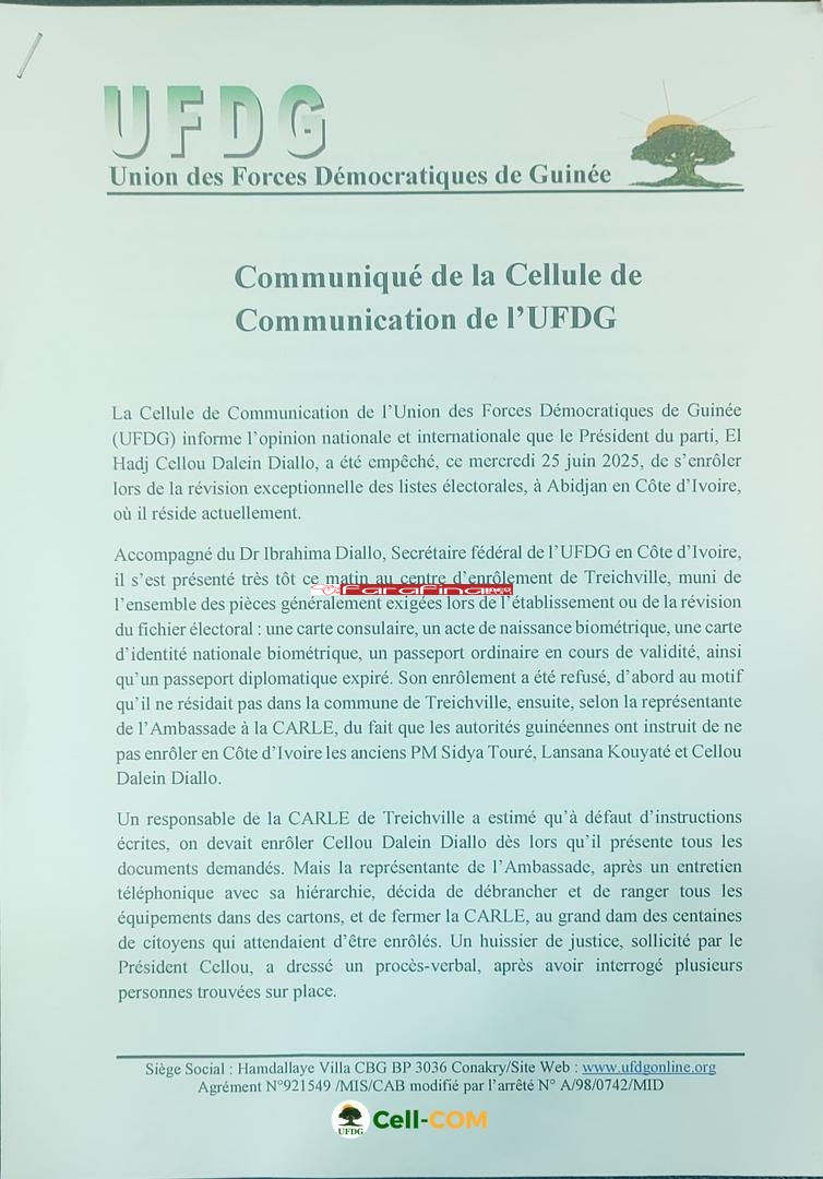 #ACTU_POLITIQUE_GUINÉENNE. « La Cellule de Communication de l’Union des Forces Démocratiques de Guinée (UFDG) informe l’opinion nationale et internationale que le Président du parti, El Hadj Cellou Dalein Diallo, a été empêché, ce mercredi 25 juin 2025, de s’enrôler lors de la révision exceptionnelle des listes électorales, à Abidjan en Côte d’Ivoire, où il réside actuellement…». C’est ainsi que la Cellule de Communication de l’UFDG a annoncé la mauvaise nouvelle …