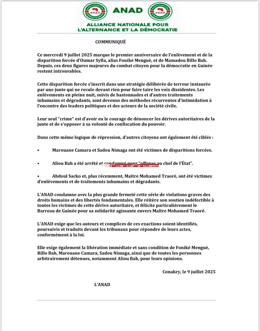 #ACTU_POLITIQUE_GUINÉENNE. « Ce mercredi 9 juillet 2025 marque le premier anniversaire de l’enlèvement et de la disparition forcée d‘Oumar Sylla, alias Foninké Menguè, et de Mamadou Billo Bah. Depuis, ces deux figures majeures du combat citoyen pour la démocratie en Guinée restent introuvables. » C’est ainsi que