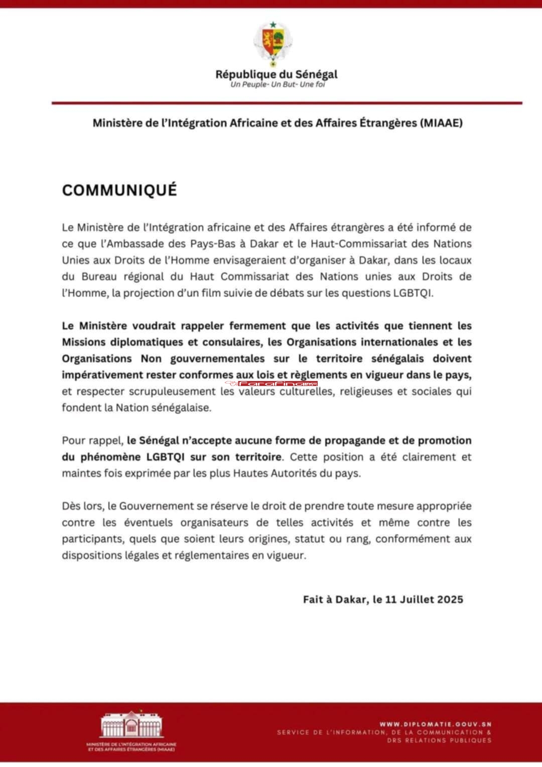 #DAKAR, SÉNÉGAL. » Le Ministère de l’Intégration africaine et des Affaires étrangères a été informé de ce que l’Ambassade des Pays-Bas à Dakar et le haut-Commissariat des Nations-Unies aux Droits de l’Homme envisageraient d’organiser à Dakar, dans les locaux du Bureau régional du Haut Commissariat des Nations-Unies aux Droits de l’Homme, la projection d’un film suivie de débat sur les questions LGBTQI…« . C’est ainsi que le Communiqué du Ministère sénégalais de l’Intégration africaine et des Affaires étrangères