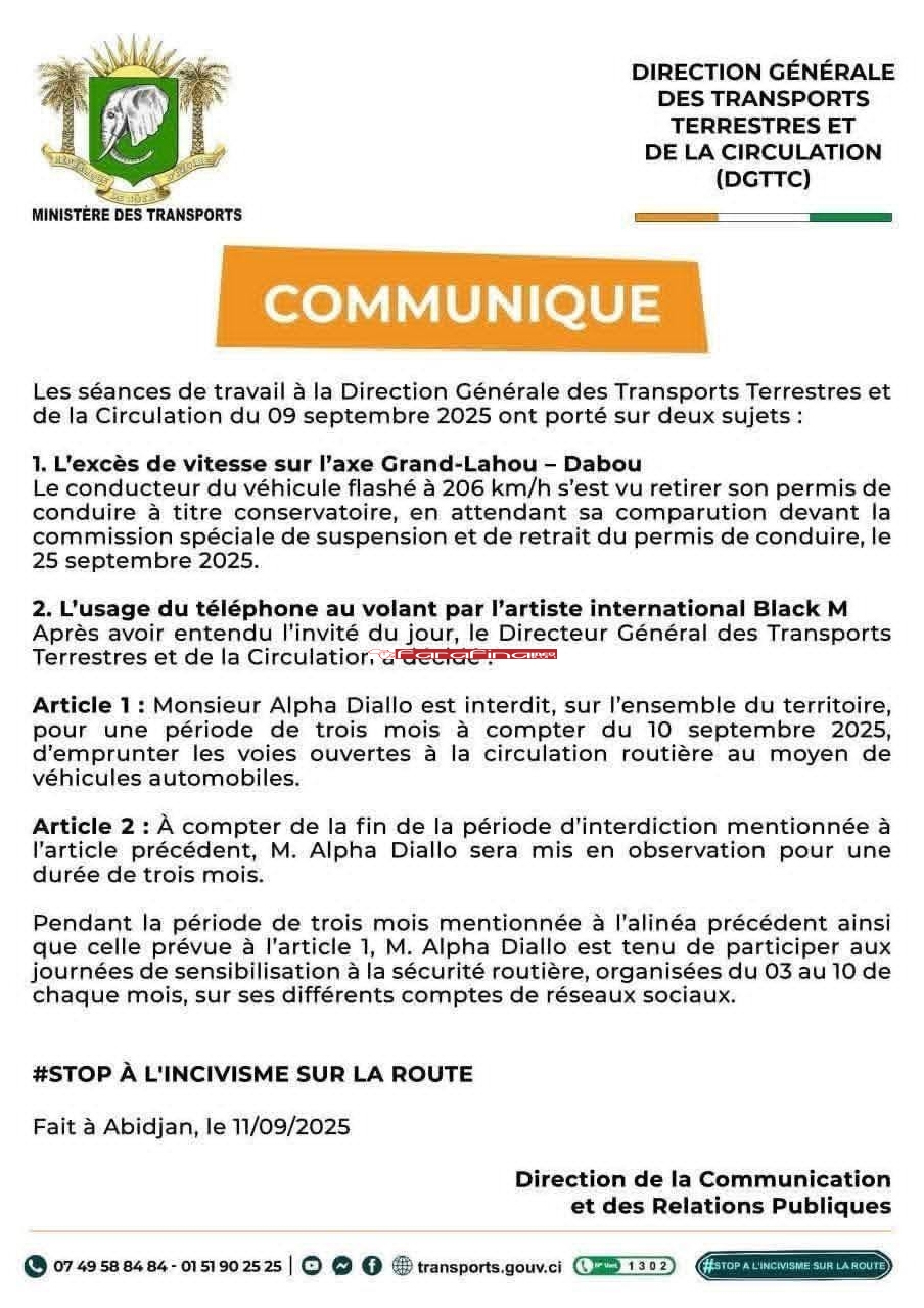 #ABIDJAN, CÔTE D’IVOIRE « Les séances de travail à a Direction Générale des Transports Terrestres et de la Circulation (DFTTC) du 09 septembre 2025 sur deux sujets : (…) 2- L’usage du téléphone au volant par l’artiste international Black M. après avoir entendu l’invité du jour … » C’est ainsi que la DGTTC a rendu public la condamnation l’artiste musicien franco-guinéen …