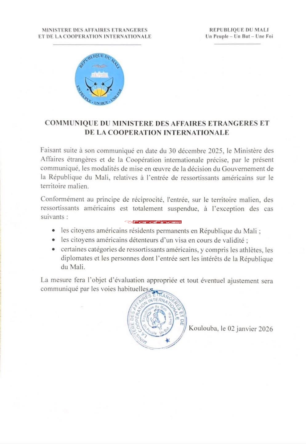 #Farafinainfo – #CoopérationUSA_MALI – Les autorités maliennes ne lâchent pas l’affaire américaine, adoptent une posture plus ferme et intransigeante. Elles annoncent d’ailleurs des nouvelles mesures de réciprocité …