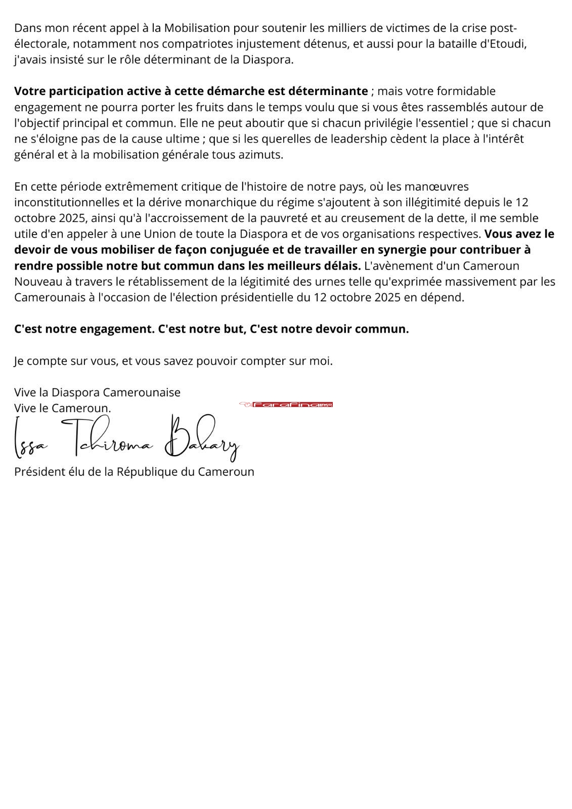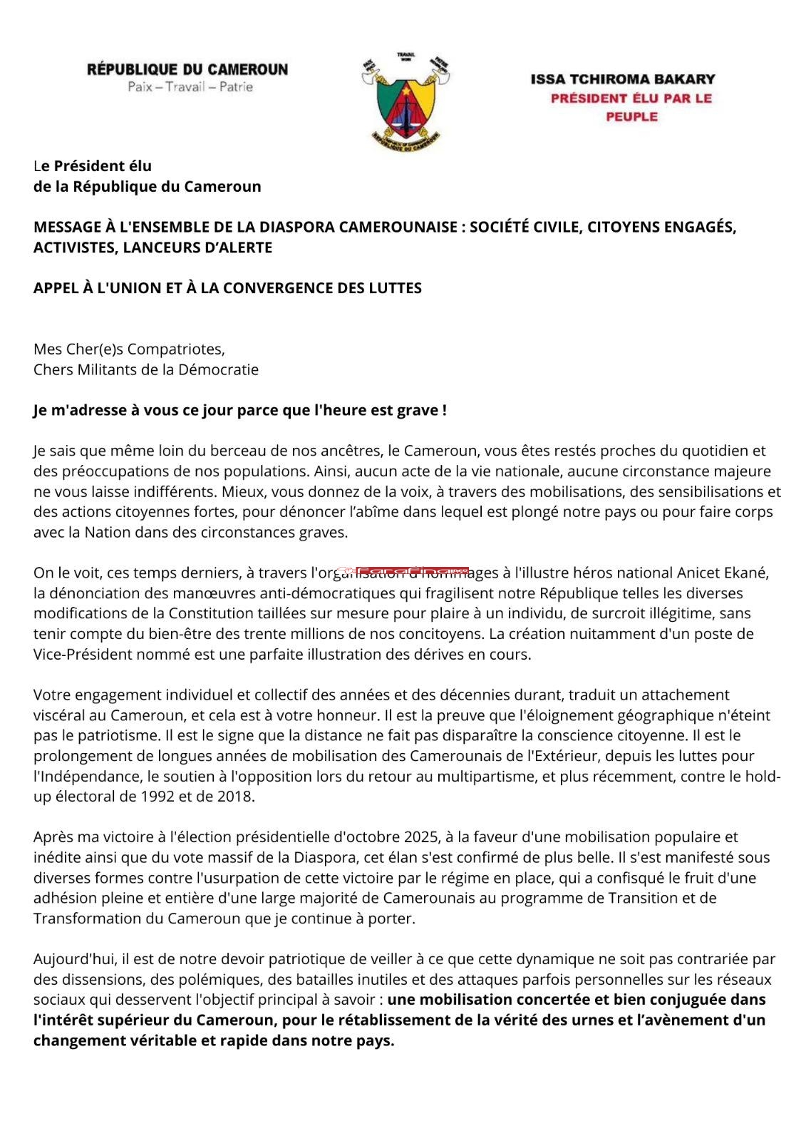 #ActuPolitiqueCMR – « Mes Cher(e)s Compatriotes, Chers Militants de la Démocratie. Je m’adresse à vous ce jour parce que l’heure est grave ! Je sais que même loin du berceau de nos ancêtres, le Cameroun, vous êtes restés proches du quotidien et des préoccupations de nos populations. Ainsi, aucun acte de la vie nationale, aucune circonstance majeure ne vous laisse indifférents. Mieux, vous donnez de la voix, à travers des mobilisations, des sensibilisations et des actions citoyennes fortes, pour dénoncer l’abîme dans lequel est plongé notre pays ou pour faire corps avec la Nation dans des circonstances graves. » C’est ainsi que le candidat malheureux de la présidentielle camerounaise d’octobre 2025 Issa Tchiroma Bakary, qui s’est autoproclamé Président de la République du Cameroun, s’est adressé à ses compatriotes camerounais de la diaspora dans un message intitulé « Message à l’ensemble de la diaspora camerounaise : société civile, citoyens engagés, activistes, lanceurs d’alerte » qui est évidemment un « appel à l’union et à la convergence des luttes ».