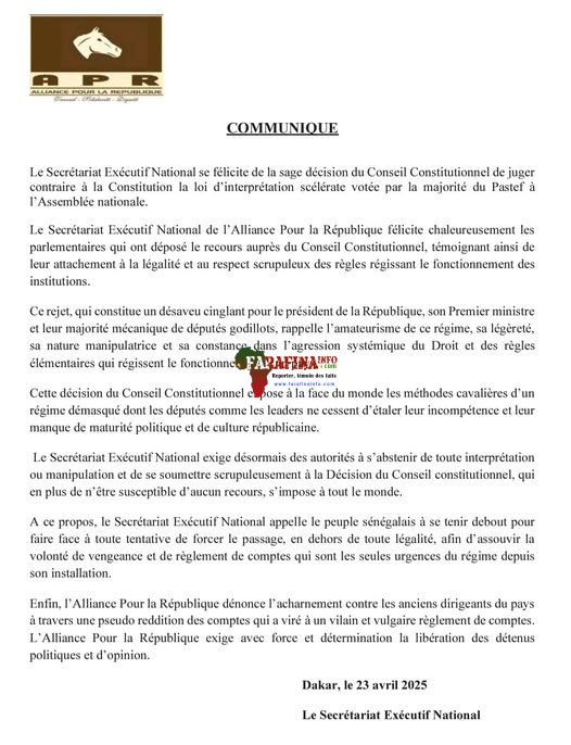 Lisez le Communiqué de l’APR (Alliance Pour la République) pour en savoir davantage …