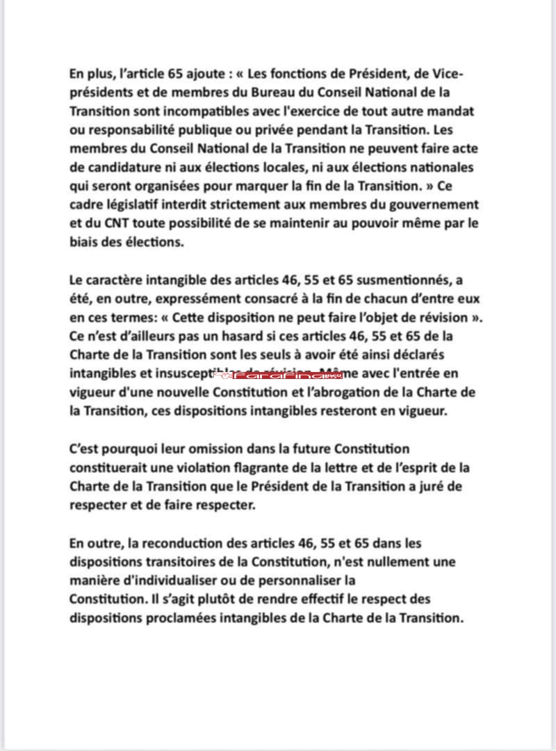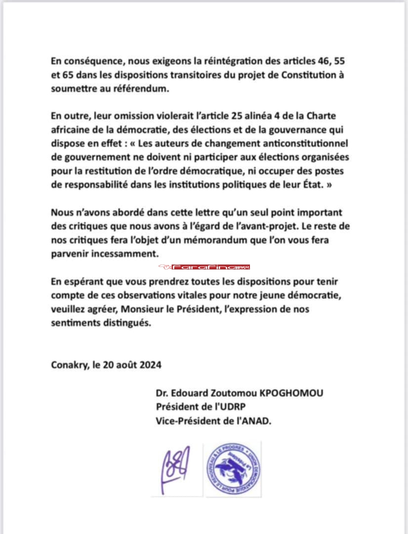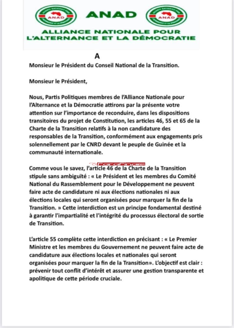 #CONAKRY, GUINÉE. « Le CNT (Conseil National de la Transition, ndlr), par la voix de son porte-parole M. Yamoussa Sidibé, s’est dit surpris de la décision de l’ANAD de rejeter fermement le projet de nouvelle Constitution. Pourtant, la position de l’ANAD est claire et constante : elle exige le retour à l’ordre constitutionnel dans le strict respect des dispositions de la Charte de la transition, en particulier les articles 46, 55 et 65, qui consacrent le principe de l’inéligibilité des membres des organes de la transition. D’ailleurs, le 20 août 2024, l’ANAD avait adressé une correspondance au CNT dans ce sens. Ci-joint, la copie de ladite lettre. » C’est ainsi que les Partis politiques regroupés sous la bannière de l’Alliance Nationale pour l’Alternance et la Démocratie (ANAD) ont mis au goût du jour un ancien courrier adressé au CNT en ces termes : « Nous, Partis Politiques membres de l’Alliance Nationale pour l’Alternance et la Démocratie attirons par la présence votre attention sur l’importance de reconduire, dans les dispositions transitoires du projet de Constitution, les articles 46, 55 et 65 de la Charte de la Transition relatifs à la non candidature des responsables de la Transition, conformément aux engagements pris solennellement par le CNRD (Comité National du Rassemblement pour le Développement, ndlr) devant le peuple de Guinée et la communauté internationale… »