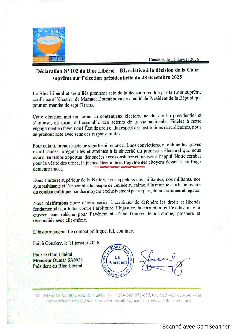 #Farafinainfo #ActuPartiPolitiqueGN – « Le Bloc Libéral et ses alliés prennent acte de la déclaration rendue par la Cour suprême confirmant l’élection de Mamadi Doumbouya en qualité de Président de la République pour un mandat de sept (7) ans … » C’est ainsi que la formation politique du candidat Dr. Faya Lansana Millimouno, qui s’est classé troisième à l’élection présidentielle guinéenne du 28 décembre 2025, a pris «acte de la déclaration…»