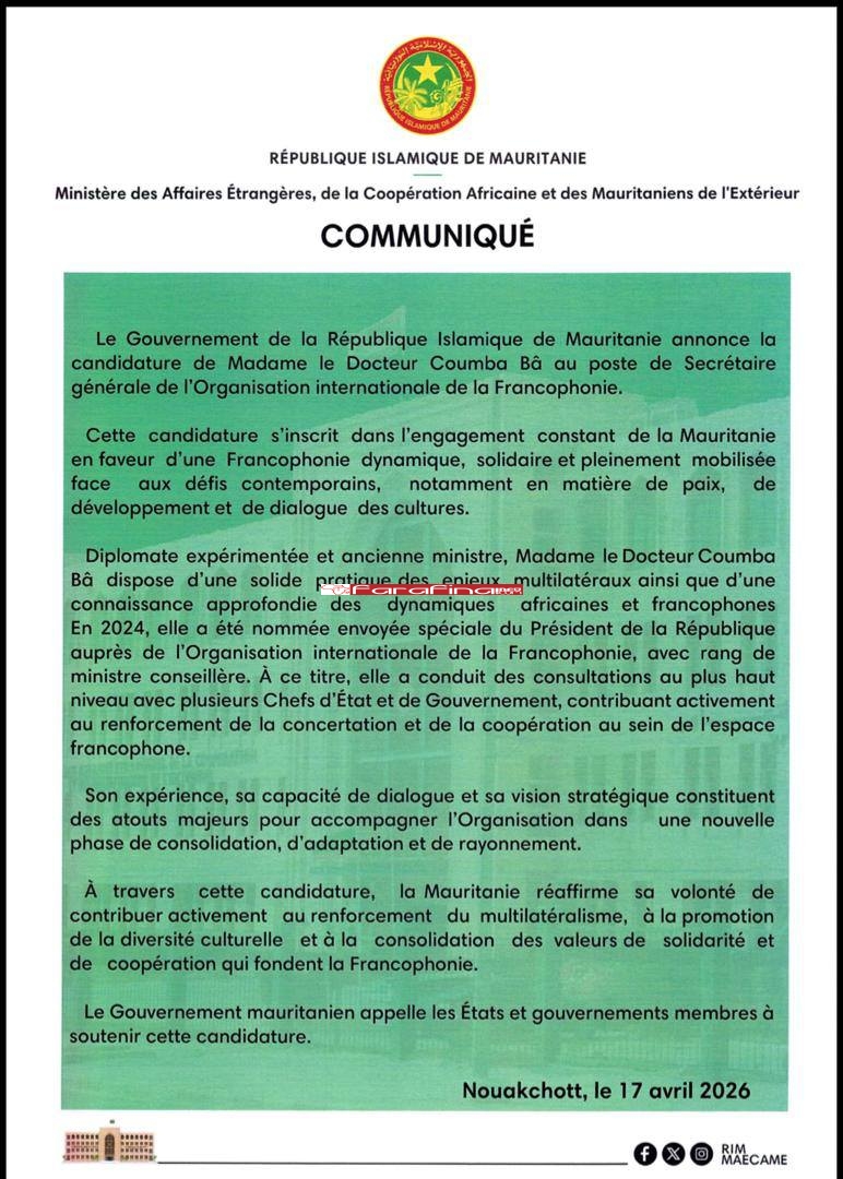 #ActuFrancophonieRIM – « Le Gouvernement de la République Islamique de Mauritanie annonce la candidature de Madame le Docteur Coumba Bâ au poste de Secrétaire Général de l’Organisation internationale de la Francophonie (OIF)… » C’est ainsi que le Ministère des Affaires Étrangères de la Coopération Africaine et des Mauritaniens de l’Extérieur a annoncé la candidature de Dr. Coumba Bâ au poste de …